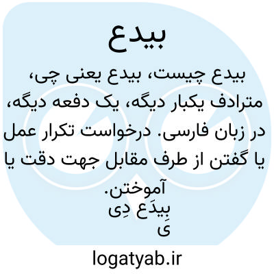 مترادف یکبار دیگه، یک دفعه دیگه، در زبان فارسی. درخواست تکرار عمل یا گفتن از طرف مقابل جهت دقت یا آموختن. بِیدَع دِی یه بار دیگه بگو.