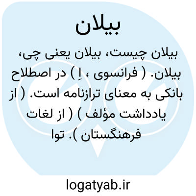 بیلان. ( فرانسوی، اِ ) در اصطلاح بانکی به معنای ترازنامه است. ( از یادداشت مؤلف ) ( از لغات فرهنگستان ). توازن. ( یادداشت مؤلف ). موازنه دخل و خرج حالت دارائی تاجر. نمودار حساب دخل و خرج بازرگان.