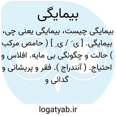 بیمایگی. [ ی َ / ی ِ ] ( حامص مرکب ) حالت و چگونگی بی مایه. افلاس و احتیاج. ( آنندراج ). فقر و پریشانی و گدائی و بی نوائی. ( ناظم الاطباء ). نداشتن مایه. نداشتن سرمایه. ( یادداشت مؤلف ):