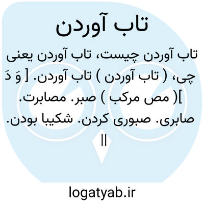 ( تاب آوردن ) ( مصدر ) ۱ - صبر کردن مصابرت شکیبا بودن.۲- تحمل کردن طاقت آوردن. ۳- برخود هموار کردن. ۴- ایجاد خلل و فساد کردن.