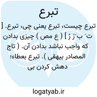 تبرع. [ ت َ ب َرْ رُ ] ( ع مص ) چیزی بدادن که واجب نباشد بدادن آن. ( تاج المصادر بیهقی ). تبرع بعطاء؛ دهش کردن بی آنکه آن دهش واجب باشد بر وی. ( از منتهی الارب ) ( از قطر المحیط ) ( از ناظم الاطباء ). بخشیدن چیزی و کردن کاری که واجب نباشد. ( غیاث اللغات ) ( آنندراج ) ( فرهنگ نظام ). چیزی بکسی دادن که واجب نباشد دادن آن. ( زوزنی ): یقال فعله متبرعاً؛ یعنی کرد آن را بنظر ثواب. ( منتهی الارب ). و فعله متبرعاً؛ ای متطوعاً او تطوعاً من غیر ان یُندَب الیه. ( قطرالمحیط ). تبرع فلان بالعطاء؛ ای تفضل بما لایجب علیه و قیل اعطی من غیر سؤال. قال الزمخشری کانه یتکلف البراعة فیه والکرم. و فی الصحاح: فعله متبرعاً؛ ای متطوعاً و هو من ذلک. ( تاج العروس ج 5 ص 273 ). || عطا کردن بدون چشم داشت عوضی. ( از اقرب الموارد ): فعله متبرعاً او تبرعاً؛ ای من غیر طلب الیه کانه ُیتکلف البراعةَ فیه والکرم. ( اقرب الموارد ). || نیکویی کردن. ( دهار ). || گاهی مجازاً بمعنی عبادت نفل آید. ( غیاث اللغات ) ( آنندراج ).