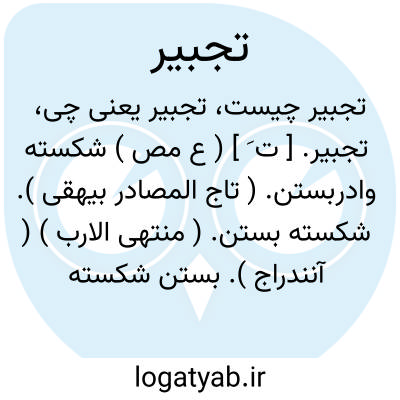 تجبیر. [ ت َ ] ( ع مص ) شکسته وادربستن. ( تاج المصادر بیهقی ). شکسته بستن. ( منتهی الارب ) ( آنندراج ). بستن شکسته را. ( ناظم الاطباء ). التیام یافتن استخوان شکسته. ( از اقرب الموارد ) ( از قطر المحیط ). || نیکو کردن حال کسی را. ( منتهی الارب ) ( ناظم الاطباء ). نیکو گردانیدن و نیکو حال شدن. ( آنندراج ). || توانگر گردانیدن. ( از اقرب الموارد ) ( منتهی الارب ) ( ناظم الاطباء ). || نیکو شدن حال فقیر و مستغنی شدن او پس از تنگدستی. ( از قطر المحیط ). || جَبَّرَ اﷲُ یُتْمَه. ( اقرب الموارد ).