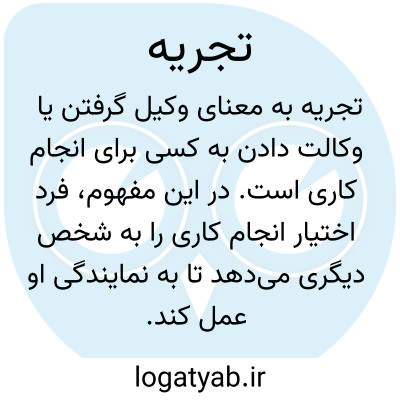 تجریه به معنای وکیل گرفتن یا وکالت دادن به کسی برای انجام کاری است. در این مفهوم، فرد اختیار انجام کاری را به شخص دیگری میدهد تا به نمایندگی او عمل کند. این واژه در متون حقوقی و ادبی برای اشاره به سپردن مسئولیت یا اختیار به دیگری استفاده میشود.