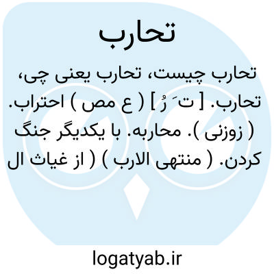 تحارب. [ ت َ رُ ] ( ع مص ) احتراب. ( زوزنی ). محاربه. با یکدیگر جنگ کردن. ( منتهی الارب ) ( از غیاث اللغات ) ( ناظم الاطباء ) ( از آنندراج ). || آتش جنگ را برافروختن. ( اقرب الموارد ). جنگ را برپای ساختن. ( قطر المحیط ).