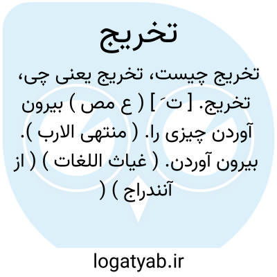 تخریج. [ ت َ ] ( ع مص ) بیرون آوردن چیزی را. ( منتهی الارب ). بیرون آوردن. ( غیاث اللغات ) ( از آنندراج ) ( ناظم الاطباء ). تخریج چیزی از جایی؛ خارج کردن آن از آن جای. ( از اقرب الموارد ) ( از المنجد ). || فرا راه افکندن شاگرد را. ( از تاج المصادر بیهقی ). شاگرد را فرا راه اوکندن. ( زوزنی ). فرا راه افکندن کسی را در علم و ادب و برساختن. ( منتهی الارب ) ( ناظم الاطباء ) ( از اقرب الموارد ) ( از المنجد ). ادب دادن بر نیکی. ( غیاث اللغات ) ( آنندراج ). || نوشتن بعض لوح را و گذاشتن بعض آنرا. ( منتهی الارب ) ( ناظم الاطباء ) ( اقرب الموارد ) ( المنجد ). || بر انواع و اقسام گردانیدن عمل را. ( منتهی الارب ) ( ناظم الاطباء ). بر انواع گرداندن عمل چنانکه بعض آن مخالف بعض دیگر باشد. ( اقرب الموارد ) ( المنجد ). || چریدن مواشی بعض جای چراگاه را و گذاشتن بعض جای آن را. ( از منتهی الارب ) ( از ناظم الاطباء ) ( اقرب الموارد ) ( المنجد ). || تقویم زمین و تعیین کردن مالیات آن. ( از اقرب الموارد ). وضع مالیات زمین. ( از المنجد ). || توجیه مسئله یا آشکار کردن گونه های آن. ( از اقرب الموارد ) ( از المنجد ). || تخریج کتابی؛ به رده افکندن و تنظیم و ترتیب کردن مواد و یادداشتهای مهیاشده تألیف مؤلفی بدست خود یا دیگری. یادداشتهای مهیاشده کتابی را بصورت کتابی منظم و مبوب و مدون درآوردن. مواد گردکرده ٔکتابی را به باب ها و فصل های آنها نهاده، ترتیب و تنظیم کردن. پاکنویس کردن. ( یادداشت بخط مرحوم دهخدا ). || تخریج مناط؛ نزد علماء علم اصول بمعنی اخالة و مناسبت است. ( کشاف اصطلاحات الفنون ). رجوع به اخالة و مناسبت شود. || عام فیه تخریج؛ سالی که در وی فراخی و تنگی است. ( منتهی الارب ). فراخی در جایی و تنگی در جایی دیگر. ( ناظم الاطباء ). || ( اِ ) در حاشیه مثنوی چ علاءالدوله، گریزگاه عمارت معنی شده و نیکلسن در شرح این لغت آورده است:صاحب فاتح الابیات آنرا نوعی ایوان و بالاخانه یا شاه نشین معنی کرده و کنایه از سر و گوشها و دستها و پاهایا اعضای خارجی بدن دانسته است، ولی من ( نیکلسن ) این معنی را دور از ذهن میدانم و تخریج در این بیت باید معنی مخرج بدهد یعنی سوراخ، دهانه، گذرگاه، دررو وگذر. ( از فرهنگ لغات و تعبیرات مثنوی ):