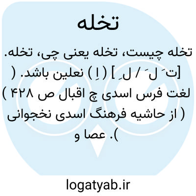 تخله. [ت َ ل َ / ل ِ ] ( اِ ) نعلین باشد. ( لغت فرس اسدی چ اقبال ص 428 ) ( از حاشیه فرهنگ اسدی نخجوانی ). عصا و نعلین. ( شرفنامه منیری ) ( فرهنگ جهانگیری ) ( برهان ) ( فرهنگ رشیدی ) ( انجمن آرا ) ( آنندراج ) ( ناظم الاطباء ). نعلین و کفش. عصا و چوبدستی. ( فرهنگ نظام ):