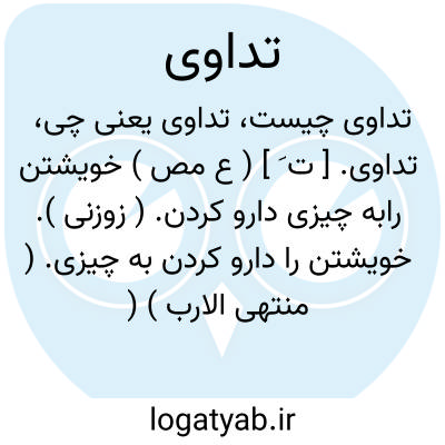 تداوی. [ ت َ ] ( ع مص ) خویشتن رابه چیزی دارو کردن. ( زوزنی ). خویشتن را دارو کردن به چیزی. ( منتهی الارب ) ( ناظم الاطباء ). دوا کردن و درمان نمودن. ( غیاث اللغات ). خود را به چیزی دارو کردن.( آنندراج ). خود را علاج کردن. ( المنجد ):