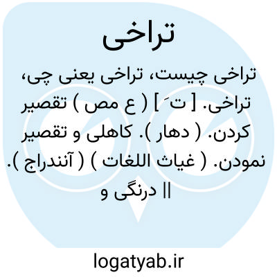 تراخی. [ ت َ ] ( ع مص ) تقصیر کردن. ( دهار ). کاهلی و تقصیر نمودن. ( غیاث اللغات ) ( آنندراج ). || درنگی و سستی و درنگ کردن، یقال: تراخی السماء؛ای ابطأت. ( منتهی الارب ). درنگی و سستی و درنگی کردن: تراخی السماء؛ درنگی کرد آسمان و نبارید. ( ناظم الاطباء ). تأخیر کردن. ( غیاث اللغات ). تأخیر کردن و دیر باریدن باران. ( آنندراج ). تأخر. ( آنندراج ) ( المنجد ). تباطؤ. ( المنجد ). تقاعس. ( اقرب الموارد ): تراخت السماء؛ ای ابطاء المطر. ( المنجد ). || بطول انجامیدن و به تعویق افتادن کاری. ( المنجد ): هر کاری را غایتی است و هر مبدأی را نهایتی که تراخی و تأخیر در توهم نمی گنجد. ( جهانگشای جوینی ). و چون مدتی از موعد بگذشت و در وصول تراخی تمام افتاد. ( جهانگشای جوینی ). و در آن چند روز خبر مغول تراخی گرفته بود. ( جهانگشای جوینی ). || سستی اسب در تاختن. ( المنجد ). || تباعد. ( اقرب الموارد ) ( المنجد ). || ( اصطلاح اصول ) واپس انداختن عمل از اول وقت آن، تا گاهی که ظن فوت آن رود. و تراخی ضد فور است. ( کشاف اصطلاحات الفنون ).