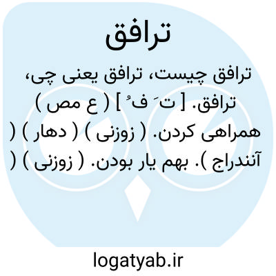 ترافق. [ ت َ ف ُ ] ( ع مص ) همراهی کردن. ( زوزنی ) ( دهار ) ( آنندراج ). بهم یار بودن. ( زوزنی ) ( از اقرب الموارد ) ( از المنجد ) ( از آنندراج ). همدیگر همراه شدن در سفر. ( منتهی الارب ) ( ناظم الاطباء ). || به اصطلاح، گفتن شعر است بر وجهی که هر مصرع او را با مصرع بیتی از آن شعر که منضم سازند معنی تمام و قافیه در ردیف مستقل باشد. ( آنندراج ). نزد شعرا عبارتست از انشاء شعر بر وجهی که اگر هر مصراع اول را با مصراع دیگر ضم کنند بیتی مستقیم باشد از همان شعر و در لفظ و معنی و قافیه هیچ خلل نیفتد. ( مجمع الصنایع از کشاف اصطلاحات الفنون ). مانند: