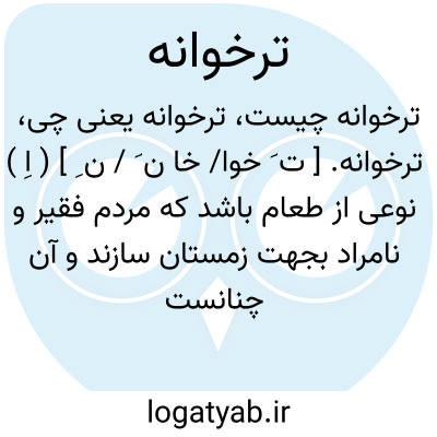 ترخوانه. [ ت َ خوا/ خا ن َ / ن ِ ] ( اِ ) نوعی از طعام باشد که مردم فقیر و نامراد بجهت زمستان سازند و آن چنانست که گندم را بلغور کنند و با داروهای گرم در آب بجوشانند تا نیک پزد و قوام گیرد و قدری آب غوره در آن ریزند و اگر میسر نباشد شیر گوسفند. و آنرا گلوله ها سازند و خشک کنند و بوقت حاجت قدری از آن بجوشانند و بخورند. ( برهان ) ( از انجمن آرا ) ( از آنندراج ). و آنرا ترخینه خوانند و بحذف خا ترینه نیز گویند. ( انجمن آرا ) ( آنندراج ). نام دیگرش ترخینه است. ( فرهنگ نظام ). رجوع به ترخانه و ترخنه و ترخینه شود. نوعی از طعام بوده که فقرا از بلغور و شیر و چیزهای دیگر پخته و قوام آورده می خشکاندند برای زمستان. ( فرهنگ نظام ):