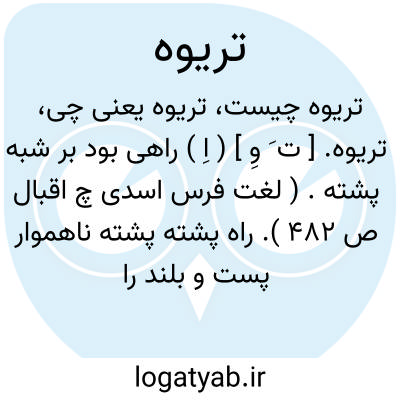 تریوه. [ ت َ وِ ] ( اِ ) راهی بود بر شبه پشته. ( لغت فرس اسدی چ اقبال ص 482 ). راه پشته پشته ناهموار پست و بلند را گویند. ( برهان ) ( از ناظم الاطباء ). راه پشته پشته بود. ( فرهنگ جهانگیری ) ( انجمن آرا ) ( آنندراج ) ( شرفنامه ٔمنیری ). راهی پشته پشته. ( صحاح الفرس ):