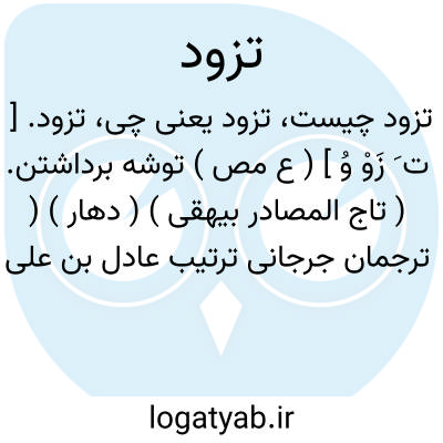 تزود. [ ت َ زَوْ وُ ] ( ع مص ) توشه برداشتن. ( تاج المصادر بیهقی ) ( دهار ) ( ترجمان جرجانی ترتیب عادل بن علی ). توشه برگرفتن. ( زوزنی ) ( آنندراج ). توشه گرفتن. ( منتهی الارب ) ( ناظم الاطباء ) ( از اقرب الموارد ) ( از المنجد ). زاد سفر برگرفتن. || برای آخرت عمل کردن. ( از متن اللغة ). رسیدن نیزه به پشت گوش کسی: تزود منی طعنة بین اذنیه؛ اصیب بها. ( اقرب الموارد ) ( از متن اللغة ). || داغ بر میان دو چشم کسی گذاشتن: تزود سمة فاضحة بین عینیه؛ اتسم بها بسعی فیه. ( اقرب الموارد ). || بردن نامه از امیر به عامل وی تا باندازه شأن و وظیفه اش برنده نامه را یاری دهد: تزود من الامیر کتاباً الی عامله، حمله ُمنه ُ الیه لیستعین به علی شأنه. ( اقرب الموارد ).