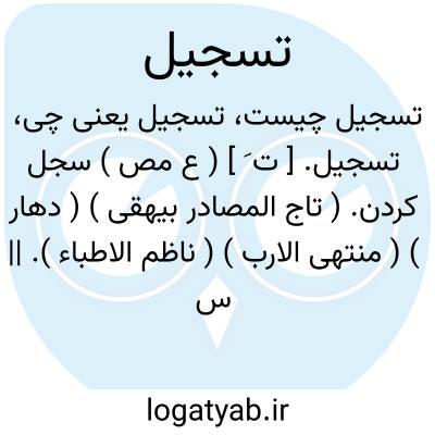 تسجیل. [ ت َ ] ( ع مص ) سجل کردن. ( تاج المصادر بیهقی ) ( دهار ) ( منتهی الارب ) ( ناظم الاطباء ). || سجل نوشتن. ( از متن اللغة ) ( از اقرب الموارد ) ( از المنجد ). قباله و تمسک نوشتن قاضی. ( آنندراج ). || قضاوت کردن و حکم کردن و اثبات کردن در سجل. ( از متن اللغة ). تقیید اوراق در محاکم و مجالس. ( از المنجد ): تسجیل الاوراق لتقییدها فی المحاکم والمجالس. ( اقرب الموارد ). || حکم کردن قاضی علیه کسی. ( از اقرب الموارد ) ( از المنجد ). || نشان گذاشتن بر چیزی و شهره ساختن آنرا. ( از متن اللغة ) ( از المنجد ). || تقریر و تثبیت کردن حق کسی را برای وی. ( از المنجد ). || ایستاده کردن نره. ( منتهی الارب ) ( آنندراج ) ( ناظم الاطباء ). انعاظ. ( متن اللغة ). || از بالا بزیر افکندن. ( منتهی الارب ) ( آنندراج ) ( ناظم الاطباء ). با تیر از بالا افکندن. ( از متن اللغة ) ( از اقرب الموارد ) ( از المنجد ). و با «با» متعدی شود چنانکه گویند سجل به؛ ای رمی به. ( از منتهی الارب ) ( از ناظم الاطباء ). || عهد و پیمان نمودن. || پرکردن حوض. ( منتهی الارب ) ( آنندراج ) ( ناظم الاطباء ).
