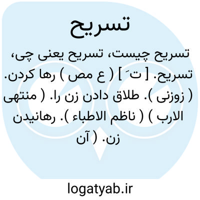 تسریح. [ ت َ ] ( ع مص ) رها کردن. ( زوزنی ). طلاق دادن زن را. ( منتهی الارب ) ( ناظم الاطباء ). رهانیدن زن. ( آنندراج ). طلاق دادن. ( از اقرب الموارد ) ( از متن اللغة ) ( از المنجد ): الطلاق مرتان فامساک بمعروف او تسریح باحسان... ( قرآن 229/2 ). || به چرا گذاشتن ستور. ( منتهی الارب ) ( ناظم الاطباء ) ( از متن اللغة ) ( از اقرب الموارد ) ( از المنجد ). چرانیدن. ( آنندراج ). چرانیدن چارپا. ( از متن اللغة ). || آسان کردن. ( تاج المصادر بیهقی ) ( زوزنی ) ( آنندراج ). آسان نمودن. ( منتهی الارب ) ( ناظم الاطباء ) ( از اقرب الموارد ) ( از متن اللغة ) ( از المنجد ). || توفیق دادن خدا کسی را در خیری. ( از متن اللغة ) ( از اقرب الموارد ) ( از المنجد ). و ازهری گوید: که این حرفی غریب است. ( از متن اللغة ). || موی فروکردن. ( زوزنی ). گشادن موی و فروهشتن آن. ( منتهی الارب ) ( ناظم الاطباء ) ( از آنندراج ). گشادن موی و فروهشتن آن پیش از شانه زدن یا بشانه. ( از متن اللغة ). شانه زدن موی. ( از اقرب الموارد ) ( از المنجد ). || رسول فرستادن بسوی کسی. ( از متن اللغة ) ( از اقرب الموارد ) ( از المنجد ). || فرستادن قوم. ( از المنجد ):و دیگری را از مصاحبان وزیر به قهستان تسریح دادند به طلب حاکم آنجا. ( جهانگشای جوینی ). و در تجهیز و تسریح عساکر به قمع و قهر ایشان مبالغت می نمود. ( جهانگشای جوینی ). || گشودن و گشایش دادن چیزی را. ( از متن اللغة ) ( از اقرب الموارد ) ( از المنجد ).