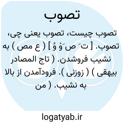 تصوب. [ ت َ ص َوْ وُ ] ( ع مص ) به نشیب فروشدن. ( تاج المصادر بیهقی ) ( زوزنی ). فرودآمدن از بالا به نشیب. ( منتهی الارب ) ( آنندراج ) ( ناظم الاطباء ). فروشدن، ضد برآمدن. ( از اقرب الموارد ). || فرودآوردن باران. ( منتهی الارب ) ( ناظم الاطباء ). فرودآمدن باران. ( آنندراج ).