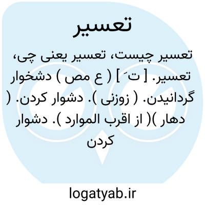 تعسیر. [ ت َ ] ( ع مص ) دشخوار گردانیدن. ( زوزنی ). دشوار کردن. ( دهار )( از اقرب الموارد ). دشوار کردن. نقیض تیسیر و منه: اللهم یسر و لاتعسر. || خلاف کردن. ( منتهی الارب ) ( آنندراج ) ( ناظم الاطباء ). خلاف کردن بر کسی. || تضییق. ( اقرب الموارد ). || دنب برداشتن شتر در وقت دویدن. ( منتهی الارب ) ( ناظم الاطباء ) ( آنندراج ). || از سوی چپ آمدن. ( منتهی الارب ) ( آنندراج ) ( ناظم الاطباء ) ( از اقرب الموارد ).