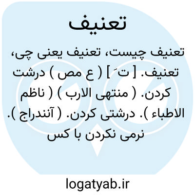 تعنیف. [ ت َ ] ( ع مص ) درشت کردن. ( منتهی الارب ) ( ناظم الاطباء ). درشتی کردن. ( آنندراج ). نرمی نکردن با کسی. ( از اقرب الموارد ). || سرزنش کردن. ( تاج المصادر بیهقی ). ملامت نمودن. ( زوزنی ). سرزنش و ملامت نمودن به درشتی. ( منتهی الارب ) ( ناظم الاطباء ). به عنف و شدت و عتاب کسی را سرزنش کردن. ( از اقرب الموارد ). سرزنش نمودن. ( آنندراج ): با من خطاب وعتاب و تشدید و تعنیف فرماید. ( سندبادنامه ص 108 ).