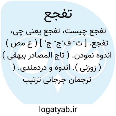 تفجع. [ ت َ ف َج ْ ج ُ ] ( ع مص ) اندوه نمودن. ( تاج المصادر بیهقی ) ( زوزنی ). اندوه و دردمندی. ( ترجمان جرجانی ترتیب عادل بن علی ). دردمند شدن از سختی و بلا و اندوه. ( منتهی الارب ) ( آنندراج ) ( ناظم الاطباء ): و استکان و استرجع بعد ان ارتاع و تفجع قال انا و انا... ( تاریخ بیهقی چ ادیب ص 300 ). او را دیدند قطرات حسرات بر رخساره با تململ و تذلل و توجع و تفجع. ( تاریخ بیهق ص 174 ). و در آن مصیبت آثار تفجع و توجع ظاهر کرد و از سرای عمارت بیرون آمد. ( ترجمه تاریخ یمینی چ 1 تهران ص 172 ). به توجع و تأسفی هرچه تمامتر و تفجع و تلهفی هرچه بیشتر فراهم آمدند. ( ترجمه تاریخ یمینی ایضاً ص 454 ).