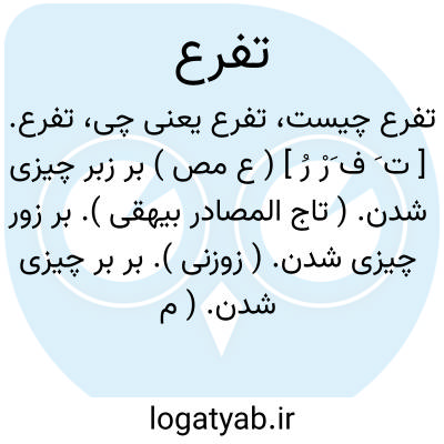 تفرع. [ ت َ ف َرْ رُ ] ( ع مص ) بر زبر چیزی شدن. ( تاج المصادر بیهقی ). بر زور چیزی شدن. ( زوزنی ). بر بر چیزی شدن. ( منتهی الارب ) ( ناظم الاطباء ). بر سر چیزی شدن. ( آنندراج ) ( از اقرب الموارد ). || شاخ بسیاری زدن. ( تاج المصادر بیهقی ). شاخ زدن. ( زوزنی ). شاخ برزدن. || بسیارشاخ شدن درخت. ( منتهی الارب ) ( آنندراج ) ( ناظم الاطباء ). بسیار گردیدن شاخه ها. ( از اقرب الموارد ). || مهترین قومی را به زنی گرفتن. ( تاج المصادر بیهقی ) ( از اقرب الموارد ). سیده قومی را بزنی خواستن. || برآمدن بر قوم و درآمدن در آنها. ( منتهی الارب ) ( آنندراج ) ( ناظم الاطباء ). به شتم برآمدن بر قوم. || برتر شدن بر قوم.( از اقرب الموارد ). || بیرون آمدن از چیزی. ( منتهی الارب ) ( آنندراج ) ( ناظم الاطباء ). دور شدن مسائل از اصل موضوع و خارج شدن. ( از اقرب الموارد ).