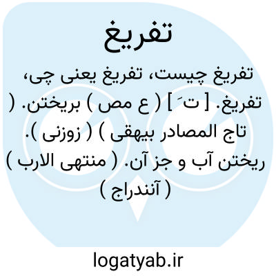 تفریغ. [ ت َ ] ( ع مص ) بریختن. ( تاج المصادر بیهقی ) ( زوزنی ). ریختن آب و جز آن. ( منتهی الارب ) ( آنندراج ) ( ناظم الاطباء ) ( از اقرب الموارد ). || ریختن خون. ( از اقرب الموارد ). || خالی کردن خنور را از آنچه در وی باشد. ( منتهی الارب ) ( ناظم الاطباء ). خالی کردن ظرف را از آنچه در وی باشد. ( آنندراج ) ( از اقرب الموارد ). || فارغ کردن. ( تاج المصادر بیهقی ) ( زوزنی ). فراغ گردانیدن. ( آنندراج ). فراغت. ( ناظم الاطباء ): سیف الدوله و بعزاجق بعد از فراغ از مهم ابوالقاسم و صاحبش و تفریغ خراسان از فساد ایشان با حضرت ناصرالدین آمدند. ( از ترجمه تاریخ یمینی چ 1 تهران ص 174 ).