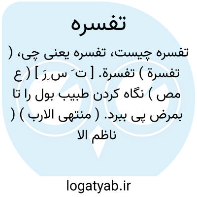 ( تفسرة ) تفسرة. [ ت َ س ِرَ ] ( ع مص ) نگاه کردن طبیب بول را تا بمرض پی ببرد. ( منتهی الارب ) ( ناظم الاطباء ) ( از اقرب الموارد ). بول نگریستن طبیب جهت پی بردن بمرض. ( آنندراج ). || ( ع اِ ) قاروره و بول مریض و علامت مرض. ( ناظم الاطباء ). آب بیمار که از آن بیماری او را شناسند و گویند که قاروره ای است که بول بیمار در آن است برای نشان دادن بطبیب و آنرا دلیل نیز نامند چه احوال بدنی بیمار را برای طبیب آشکار سازد. گویند: نظر الطبیب فی تفسرة المریض. و در «بصائر» آمده است. هرچیز که حال چیزی را بیان کند تفسره آن است. ( از اقرب الموارد ). تفسره، قاروره ای که در نزد طبیب برند. ( ناظم الاطباء ). پیشاب بیمار که طبیب برای تشخیص علت بیند و آزماید. شیشه ای که در آن پیشاب بیمار کنند تا بطبیب عرضه دارند و آن را قاروره و دلیل نیز گویند. ( یادداشت بخط مرحوم دهخدا ). نزد پزشکان ظرفی از آبگینه را گویند که بول بیمار در آن ریزند تا به پزشک عرضه دارند. و آنرا دلیل نیز گویند و وجه تسمیه آن به تفسره برای آن است که احوال جسمانیه بیمار را در نظر پزشک تفسیر میکند و روشن میسازد. ( کشاف اصطلاحات الفنون ): در تفسره صفرت او نگریست بدانست که جوان درتب منطبق عشق است. ( سندبادنامه ص 189 ). تفسره دل بدو نمود و نبض عشق پیش او داشت. ( سندبادنامه ص 238 ).
