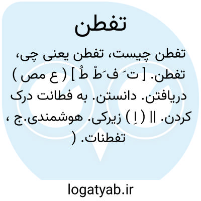 تفطن. [ ت َ ف َطْ طُ ] ( ع مص ) دریافتن. دانستن. به فطانت درک کردن. || ( اِ ) زیرکی. هوشمندی.ج، تفطنات. ( فرهنگ فارسی معین ). و رجوع به تفطین.