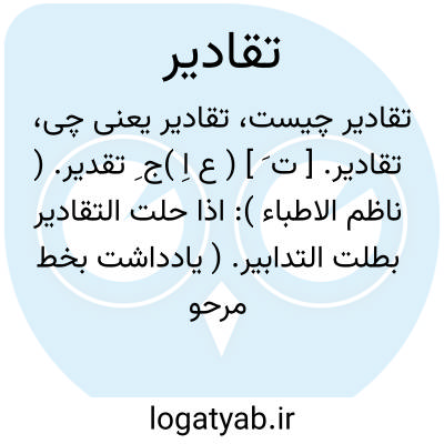 تقادیر. [ ت َ ] ( ع اِ )ج ِ تقدیر. ( ناظم الاطباء ): اذا حلت التقادیر بطلت التدابیر. ( یادداشت بخط مرحوم دهخدا ): و انواع تدابیر موافق انوار تقادیر نمی آید. ( سندبادنامه ص 55 ). تقادیر مخالف تدابیر است. ( سندبادنامه ص 278 ).
