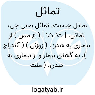 تماثل. [ ت َ ث ُ ] ( ع مص ) از بیماری به شدن. ( زوزنی ) ( آنندراج ). به گشتن بیمار و از بیماری به شدن. ( منتهی الارب ) ( ناظم الاطباء ) ( از اقرب الموارد ): امید از تماثل و انتعاش برداشت و به آب و هوای غزنه مشتاق گشت. ( ترجمه تاریخ یمینی ). || مانند یکدیگر شدن. ( زوزنی ) ( دهار ) ( منتهی الارب ) ( از آنندراج ) ( ناظم الاطباء ). تشابه دو چیز. ( از اقرب الموارد ). مساوی یکدیگر شدن دو چیز مانند 3 با 3 و 4 با 4. ( از تعریفات جرجانی ). || تماثل و مماثله، در اصطلاح محاسبان هر دو عدد برابر یکدیگر را گویند و این دو عدد متماثل یکدیگر باشند. ( از کشاف اصطلاحات الفنون ). رجوع به مماثله و متماثل شود. || اصطلاح علماء کلام و حکمت. رجوع به مثل و کشاف اصطلاحات الفنون شود. || اصطلاح فن بدیع. رجوع به موازنه و کشاف اصطلاحات الفنون شود.