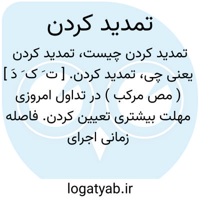 تمدید کردن. [ ت َ ک َ دَ ] ( مص مرکب ) در تداول امروزی مهلت بیشتری تعیین کردن. فاصله زمانی اجرای امری را افزودن. انجام دادن تعهدی را به تأخیر انداختن. و بیشتر در مورد افزودن مدت پرداخت دین بکار رود: سفته فلان کس تمدید شد.
