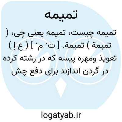 ( تمیمة ) تمیمة. [ ت َ م َ ] ( ع اِ ) تعویذ ومهره پیسه که در رشته کرده در گردن اندازند برای دفع چشم بد. ج، تمیم، تمائم. و فی الحدیث: من علق تمیمة فلا اتم اﷲ له و اما المعاذات اذا کتب فیها القرآن و اسمأاﷲتعالی فلابأس بها. ( منتهی الارب ). به معنی تعویذ و مهره سیاه و سفید که در گردن طفلان اندازند.( از غیاث اللغات ) ( از آنندراج ). تمیمه: