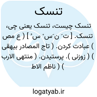 تنسک. [ ت َ ن َس ْ س ُ ] ( ع مص ) عبادت کردن. ( تاج المصادر بیهقی ) ( زوزنی ). پرستیدن. ( منتهی الارب ) ( ناظم الاطباء ) ( آنندراج ). تزهد و تعبد. ( اقرب الموارد ). خداپرستی. ( غیاث اللغات ) ( از آنندراج ): منزوی شد و روی به عبادت آورد و به تنسک تمسک جست و از ملک استعفا نمود. ( ترجمه تاریخ یمینی چ 1 تهران ص 203 ). چه آستان که چون کعبه به خاکپای رکبان آن تمسک سزا و بموافقت و ارکان آن تنسک روا. ( ترجمه تاریخ یمینی ایضاً ص 453 ).