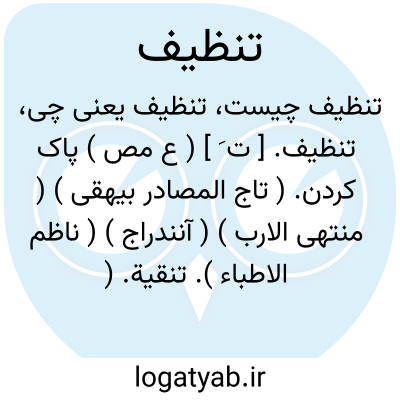 ۱ - ( مصدر ) پاک کردن پاکیزه ساختن. ۲ - ( اسم ) پاکیزگی. ۳ - رفت و روب ( خیابانها و کوچه های شهر ). جمع: تنظیفات.