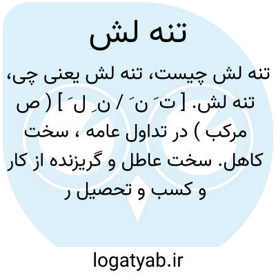 تنه لش. [ ت َ ن َ / ن ِ ل َ ] ( ص مرکب ) در تداول عامه، سخت کاهل. سخت عاطل و گریزنده از کار و کسب و تحصیل روزی. تنبل. بیکاره. بی تعصب. بی ننگ و عار. ( یادداشت بخط مرحوم دهخدا ). || توسعاً، دشنام گونه ایست که با بزرگی جثه کاهل و بیکاره است. دشنامی است بمعنی بیکاره که هیچ کار نکند و تن بکار ندهد. ( یادداشت ایضاً ).