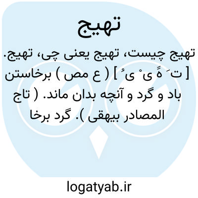 تهیج. [ ت َ هََ ی ْ ی ُ ] ( ع مص ) برخاستن باد و گرد و آنچه بدان ماند. ( تاج المصادر بیهقی ). گرد برخاستن. ( زوزنی ). برخاستن باد و غبار و غیره. ( غیاث اللغات ) ( آنندراج ). || برانگیخته گردیدن و جنبیدن. ( منتهی الارب ) ( ناظم الاطباء ) ( از اقرب الموارد ): تا اوباش و غوغا را از تهیج حرب و فتنه باز دارند. ( سندبادنامه ص 202 ). رجوع به تهییج شود.