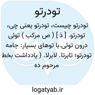 تودرتو. [ دَ ] ( ص مرکب ) توئی درون توئی.با توهای بسیار: جامه تودرتو؛ تابرتا. لابرلا. ( یادداشت بخط مرحوم دهخدا ). || که بیکدیگر در وراه دارد: اطاقهای تودرتو؛ که بیکدیگر در دارند. که هر یک را به دیگر راه و در است. ( یادداشت ایضاً ).