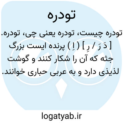 تودره. [ دَ رَ / رِ ] ( اِ ) پرنده ایست بزرگ جثه که آن را شکار کنند و گوشت لذیذی دارد و به عربی حباری خوانند. ( برهان ). جانوری است بزرگ جثه که گوشت آن لذیذ است و آن را چال نیز گویند. ( فرهنگ جهانگیری ). هوبره و حباری. ( ناظم الاطباء ) ( فرهنگ فارسی معین ). مرغی است بزرگ که آن را شکار کنند. گوشت لذیذی دارد و به عربی حباری گویند و به هوبره مشهور است و بیشتر آن را با چرغ شکار کنند، و آن را به فارسی چال نیز گویند. ( انجمن آرا ) ( آنندراج ):