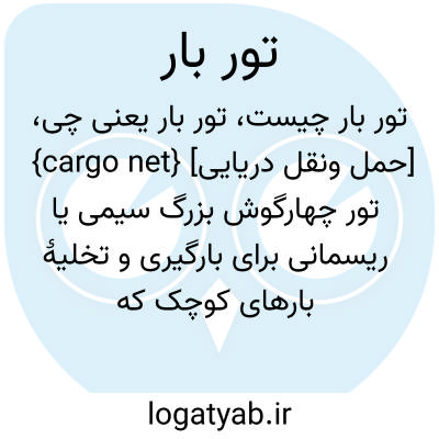{cargo net} [حمل ونقل دریایی] تور چهارگوش بزرگ سیمی یا ریسمانی برای بارگیری و تخلیۀ بارهای کوچک که هر گوشۀ آن به حلقه ای برای اتصال به بارقلاب منتهی می شود