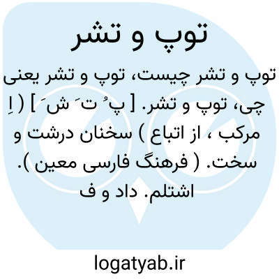 توپ و تشر. [ پ ُ ت َ ش َ ] ( اِ مرکب، از اتباع ) سخنان درشت و سخت. ( فرهنگ فارسی معین ). اشتلم. داد و فریاد ترسانیدن کسی را: با این توپ و تشرها او از میدان درنمی رود. ( یادداشت بخط مرحوم دهخدا ).