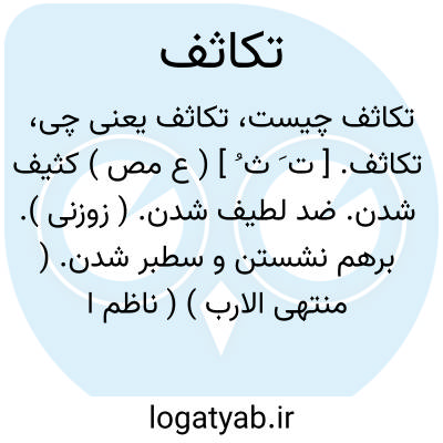 تکاثف. [ ت َ ث ُ ] ( ع مص ) کثیف شدن. ضد لطیف شدن. ( زوزنی ). برهم نشستن و سطبر شدن. ( منتهی الارب ) ( ناظم الاطباء ) ( از اقرب الموارد ). سطبر و غلیظ شدن و برهم نشستن. ( آنندراج ) ( از غیاث اللغات ). هنگفتی و ستبری و غلظت. ( ناظم الاطباء ). درهمی. انبوهی. سطبری. ( یادداشت بخط مرحوم دهخدا ). کم شدن حجم جسمی یا بیرون شدن هوا یا آب آن و نزدیک شدن اجزاء اصلی آن بیکدیگر. مقابل تخلخل. ( یادداشت ایضاً ). هو انتقاص اجزاء المرکب من غیر انفصال شی ٔ. ( تعریفات جرجانی ) ( از کشاف اصطلاحات الفنون ): امیر نصر از کثرت و تکاثف اعداد ایشان احتیاط در آن شناخت که چون جمشید خورشید در تتق آل عباس محتجب شد بر مرکب اکهب شب روی به مرو آورد. ( ترجمه تاریخ یمینی ). || سخت شدن. زفت شدن:فانه [ خبز السلت ] اذا برد تکاثف تکاثفاً شدیداً حتی ان من یأکله بعد یوم او یومین یظن ان فی بطنه طیناً. ( ابن البیطار از یادداشت بخط مرحوم دهخدا ). || ( اصطلاح فیزیک ) مقایسه کردن توده ویژه اجسام با یکدیگر. چگالی یک جسم نسبت به جسم دیگر مساوی نسبت توده ویژه آنهاست. ( فرهنگ فارسی معین ). التصاق ذرات جسم را گویند ( ضد انبساط ) که نسبت مستقیم باوزن مخصوص جسم دارد. جرم یک سانتیمتر مکعب از یک گاز کثافت مخصوص آن گاز است. تکاثف نسبی هر گاز نسبت وزن معینی از آن گاز است به هوای حجم آن. تکاثف مطلق همان وزن مخصوص است. و تکاثف الکتریسیته، عملی است که به توسط آن الکتریسیته را در جسمی ذخیره می کنند.