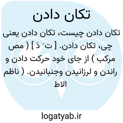 تکان دادن. [ ت َ دَ ] ( مص مرکب ) از جای خود حرکت دادن و راندن و لرزانیدن وجنبانیدن. ( ناظم الاطباء ). || جنبانیدن چنانکه دوای مایع را در شیشه. ( یادداشت بخط مرحوم دهخدا ). || به زیر و بالا بسختی و شدت پیاپی حرکت دادن، چنانکه فرش قالین را برای فروریزانیدن گرد انباشته درون تار و پود آن. ( یادداشت ایضاً ). || افشاندن. افشانیدن. نفض. ( یادداشت ایضاً ).