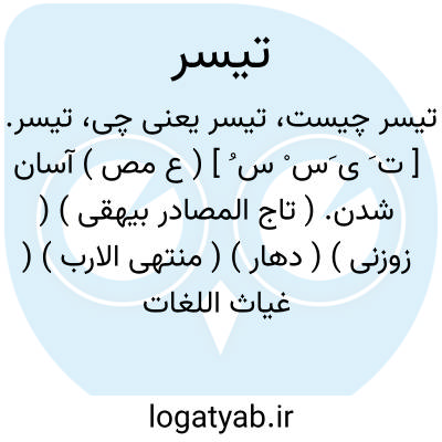 تیسر. [ ت َ ی َس ْ س ُ ] ( ع مص ) آسان شدن. ( تاج المصادر بیهقی ) ( زوزنی ) ( دهار ) ( منتهی الارب ) ( غیاث اللغات ) ( آنندراج ) ( ناظم الاطباء ). آسان شدن کاری. ( از اقرب الموارد ): نامه فرمودیم با رکابداری مسرع تا از آنچه ایزد عز و جل تیسر کرد... واقف شده آید. ( تاریخ بیهقی چ ادیب ص 208 ). رجوع به تیسیر شود. || سرد گردیدن روز. ( منتهی الارب ) ( آنندراج ) ( ناظم الاطباء ) ( از اقرب الموارد ). || آماده شدن. ( منتهی الارب ) ( آنندراج ) ( ناظم الاطباء ). آماده شدن جنگ را. ( از اقرب الموارد ).