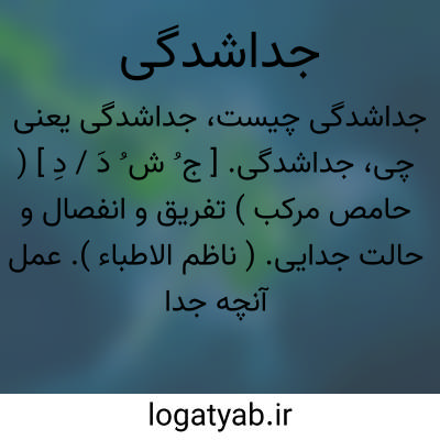 جداشدگی. [ ج ُ ش ُ دَ / دِ ] ( حامص مرکب ) تفریق و انفصال و حالت جدایی. ( ناظم الاطباء ). عمل آنچه جدا میشود.