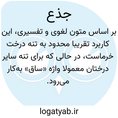 (بر وزن حبر) تنه درخت خرما. گویا فقط در تنه درخت خرما به کار رفته و به تنه درختان دیگر ساق گویند صحاح و قاموس و اقرب و غیره همه تنه درخت خرما گفته‏اند. درد زاذن او را سوی تنه نخل کشید. در تنه‏های نخل بدارتان می‏زنم. کلمه جذع دو بار و جمع آن جذوع فقط یکبار در قرآن مجید یافت می‏شود.