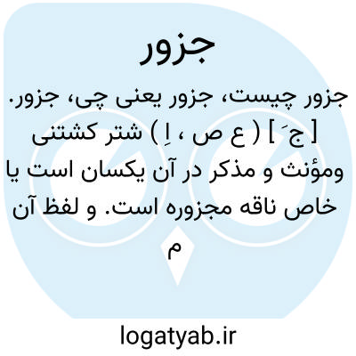 جزور. [ ج َ ] ( ع ص، اِ ) شتر کشتنی ومؤنث و مذکر در آن یکسان است یا خاص ناقه مجزوره است. و لفظ آن مؤنث است هرچند مقصود مذکر باشد. تقول: هذه الجزور. ( از منتهی الارب ) ( ناظم الاطباء ). شتر کشتنی. ( دهار ). خصوص شتر که مؤنث و مذکر در آن یکسان است و لفظ آن مؤنث است چنانکه گویند: «رعت الجزور». و صغانی گوید: جزور ناقه کشتنی است. ( از اقرب الموارد ). ناقه مجزوره که مؤنث و مذکر در آن یکسان است یا شتر یا یک رأس شتر، نر باشد یا ماده. ( از متن اللغة ). اشتر کشتنی. ( مهذب الاسماء ). ج، جَزائِر، جُزُر، جُزُرات. ( منتهی الارب ) ( متن اللغة ) ( اقرب الموارد ). || گوسپند کشتنی. جَزَرَة، یکی آن. ( منتهی الارب ) ( ناظم الاطباء ) ( از متن اللغة ). || ج ِ جَزرَة. ( از متن اللغة ) ( از منتهی الارب ) ( ازناظم الاطباء ) ( آنندراج ). || شتری که پنج سال گذاشته و به ششم درآمده است. ( یادداشت مؤلف ).