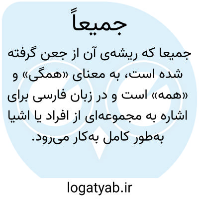 جمیعاً که ریشه‌ی آن از جَعَن گرفته شده است، به معنای «همگی» و «همه» است و در زبان فارسی برای اشاره به مجموعه‌ای از افراد یا اشیاء به‌طور کامل به‌کار می‌رود. این واژه در مواردی به کار می‌رود که قصد داریم بر جامعیت و فراگیری یک گروه یا مجموعه تأکید کنیم و نشان دهیم که هیچ موردی از قلم نیفتاده است. به عبارت دیگر، جمیعاً بیانگر جمعیتی است که تمام اعضای آن در نظر گرفته شده‌اند و هیچ فرد یا جزء جداگانه‌ای مستثنی نیست.