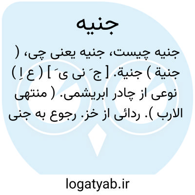 ( جنیة ) جنیة. [ ج َ نی ی َ ] ( ع اِ ) نوعی از چادر ابریشمی. ( منتهی الارب ). ردائی از خز. رجوع به جنینة شود. || گناه. ( اقرب الموارد ) ( مهذب الاسماء ). ج، جنایا. ( مهذب الاسماء ).
