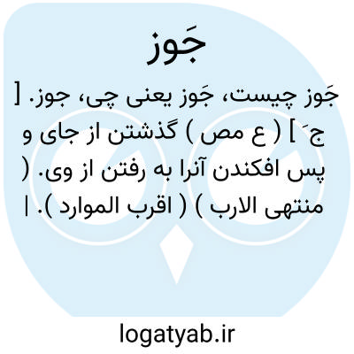 جوز. [ ج َ ] ( ع مص ) گذشتن از جای و پس افکندن آنرا به رفتن از وی. ( منتهی الارب ) ( اقرب الموارد ). || ( اِ ) میانه چیزی. ( منتهی الارب ) ( غیاث اللغات ). وسط چیزی. ( غیاث اللغات ). || معظم چیزی. ج، اجواز. ( منتهی الارب ). || ( معرب، اِ ) از فارسی. ( جمهرة از المزهر ). گردو. ( اقرب الموارد ) ( منتهی الارب ). چهارمغز. معرب گوز است که گردکان باشد. ( برهان ) ( المعرب جوالیقی ):