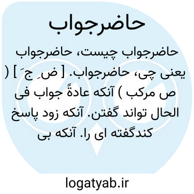 ( صفت ) ۱ - آنکه مهیای جواب گفتن است آماده و مهیای پاسخ گفتن آنکه عادتا جواب فی الحال تواند گفتن آنکه زود پاسخ کند گفته را: (( ساقیان نادره گویند. شیرین ادا مطربان چابک طمغاجی حاضر جواب. ) ) ( مختاری غزنوی ) ۲ - شوخ گستاخ.