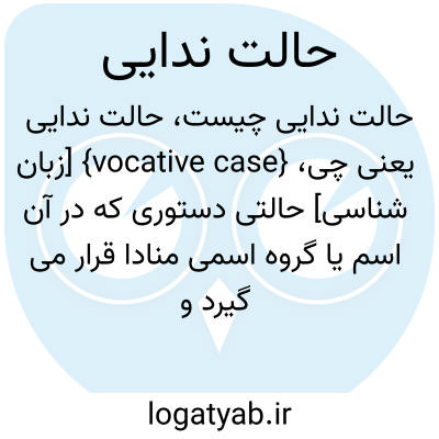 {vocative case} [زبان شناسی] حالتی دستوری که در آن اسم یا گروه اسمی منادا قرار می گیرد و در فارسی با «ای» یا «ایا» پیش از اسم یا «ا» در پایان آن یا صرفاً با تغییر آهنگ مشخص می شود متـ.حالت آیی ندایی، آیی vocative