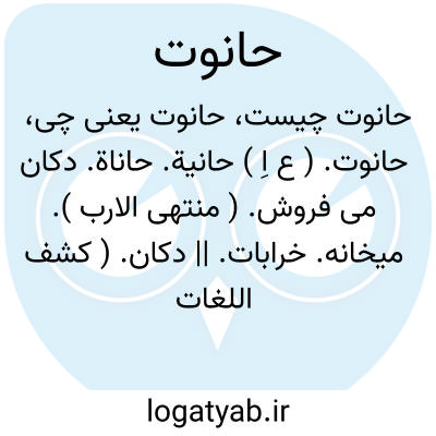 به ده برد انبان گندم بدوش.سعدی ( بوستان ).دکان الخمار. یؤنث و یذکر و الخمار نفسه. ( اقرب الموارد ). دکان شراب فروشی. مرد شراب فروش. || کربک. کلبه. ( مهذب الاسماء ). کربج. کربق. ج، حوانیت. ( مهذب الاسماء ) ( اقرب الموارد ). ج، حوانی. و النسبة الیه حانی و حانوی. ( اقرب الموارد ).